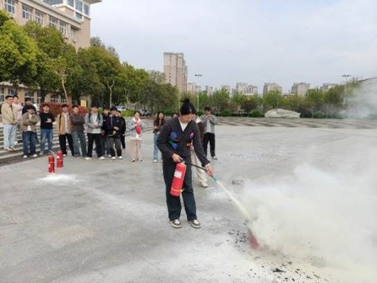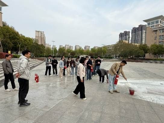 疏散至集合点后,袁老师现场演示了灭火器的正确使用方法,并要求学生轮流使用灭火器,直到每一位学生都能准确、熟练地完成灭火器操作,真正做到“懂原理、会操作、能应急”。